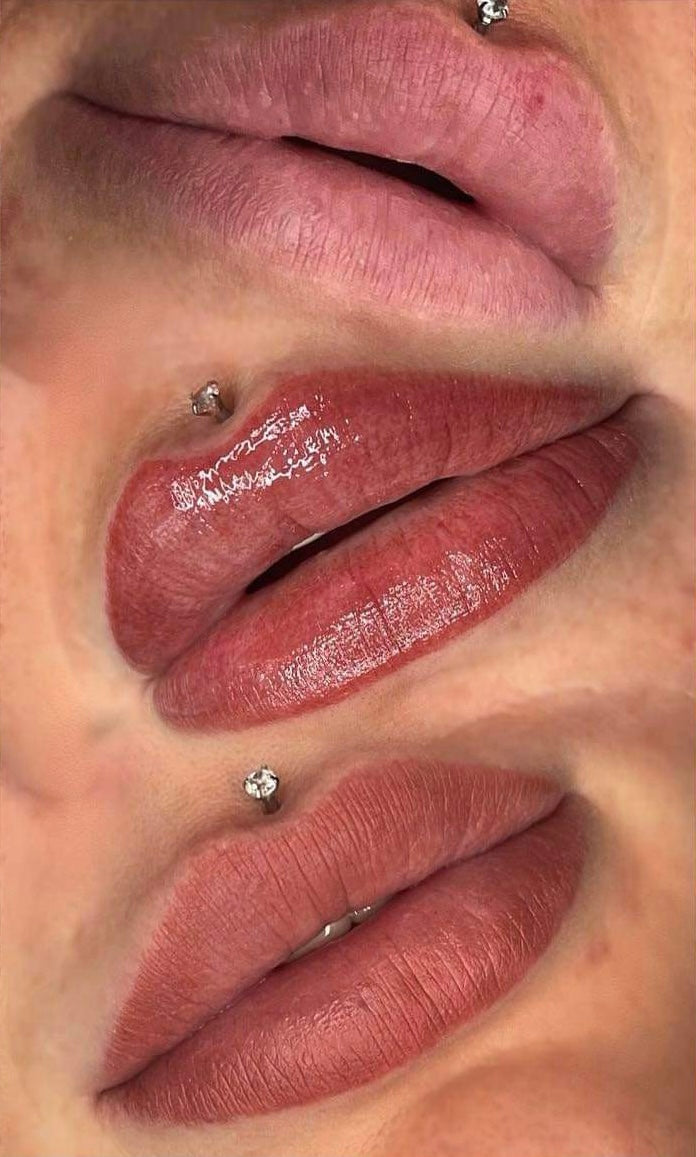Lip blushing is a form of cosmetic tattoo that enhances the lips' natural tint and shape, giving them a boost and a glossy touch. It's designed to define and outline your lips.